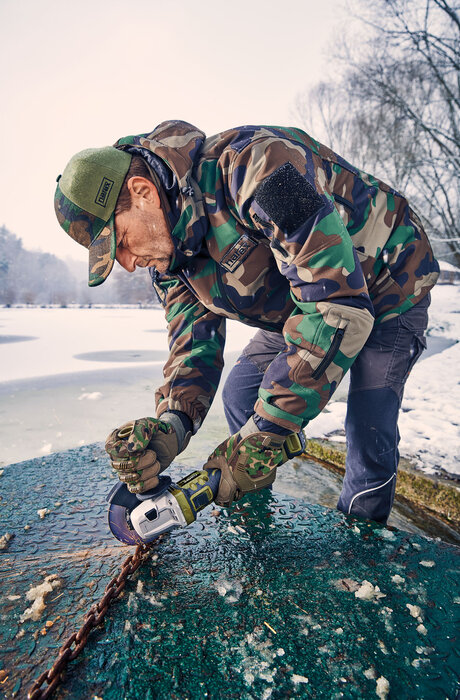 Vyhřívaná softshellová bunda Narex v trendy kamuflovaném designu je ideálním doplňkem pro práci